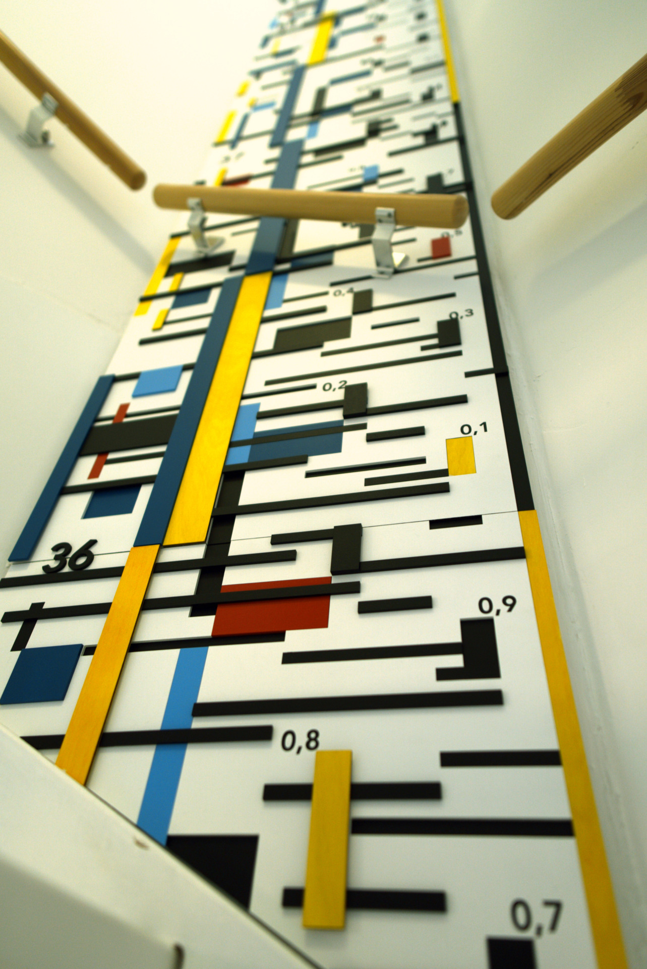 Upstairs Downstairs is een abstract kunstwerk, speciaal gemaakt voor de lepe hoek in het trappenhuis van een woning in Arnhem. Deze lepe hoek, de schuine wand waarachter alle leidingen lopen, loopt over een lengte van 6,5 meter van beneden naar boven, van de begane grond tot aan de zolder. Deze hoogte, die nog eens benadrukt wordt door de smalle breedte van 50 cm, is een belangrijk gegeven. De hoogte is ook terug te vinden in een andere inspiratiebron, op hoeveel meter je je in het trappenhuis boven NAP bevindt en de daarbij behorende peilstok.
