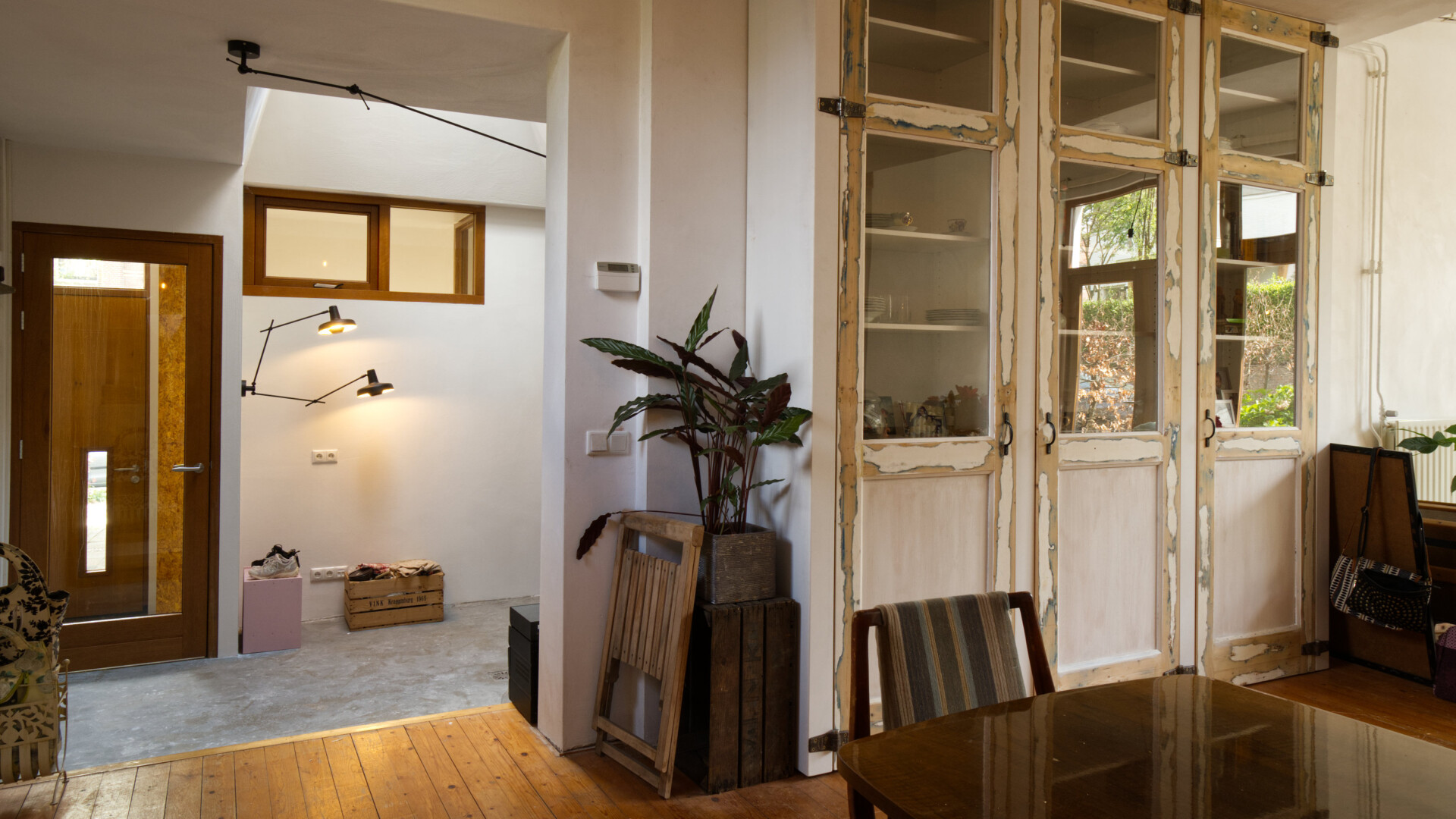 Door het samen voegen van een beneden- en boven woning werd het mogelijk om wonen en werken in één pand te combineren. Voor het werken op de begane grond is in het interieur ontwerp in grote lijnen de bestaande plattegrond in ere gehouden.