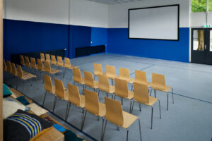 We hebben ingezet op grote lijnen, grote gebaren om de verschillende ruimtes meer één geheel te laten zijn. De vloerbedekking is daarbij het uitgangspunt. De blauwe sportvloer in de Hopzaal, de oude gymzaal en het groengrijze marmoleum in de rest van het gebouw. De verschillende ruimtes (de buitenruimte, gevel met entree, horeca, gang, vergaderruimtes en…