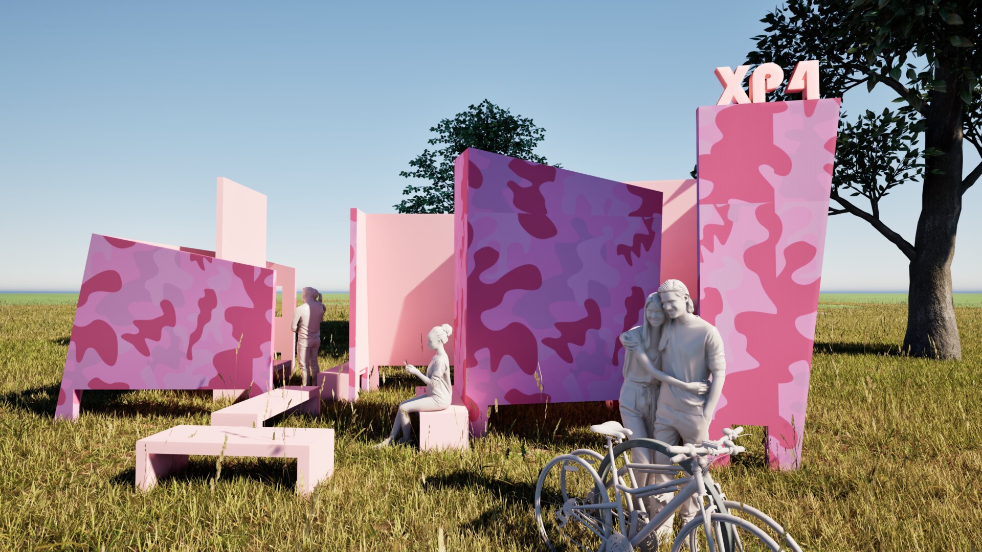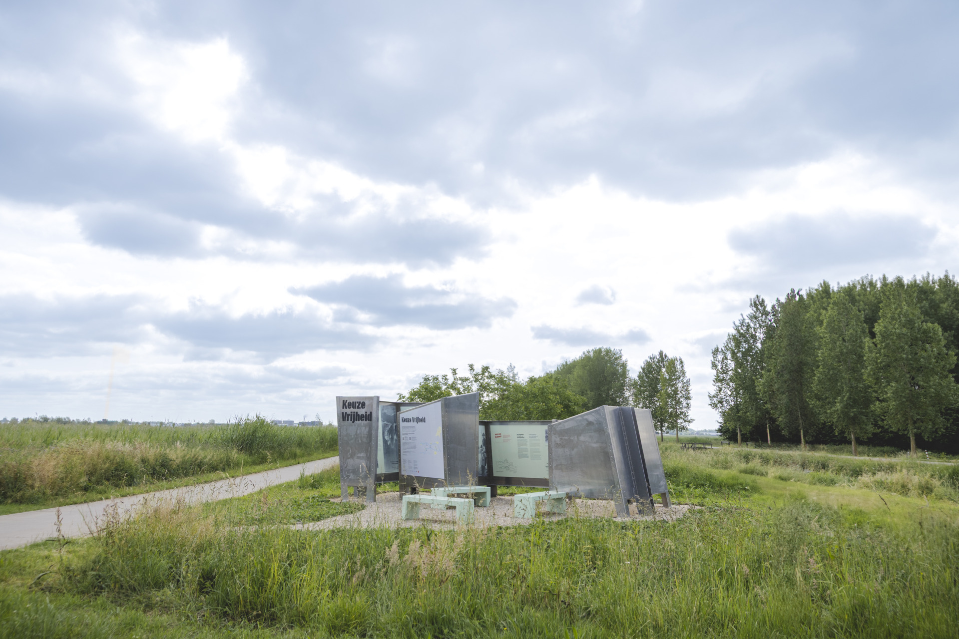 Deze buiten tentoonstelling is een ruimtelijk ontwerp dat het spanningsveld tussen verleden en heden tastbaar maakt. Het gebruik van aluminium verwijst naar de vliegtuigen die tijdens de luchtoorlog het Rivierengebied markeerden. De installatie slingert als een rivier door het landschap – een krachtige metafoor voor tijd en perspectief. Intieme ruimtes binnen het ontwerp nodigen bezoekers uit om stil te staan bij de dilemma’s uit de Tweede Wereldoorlog, zonder volledig overzicht, net als destijds.